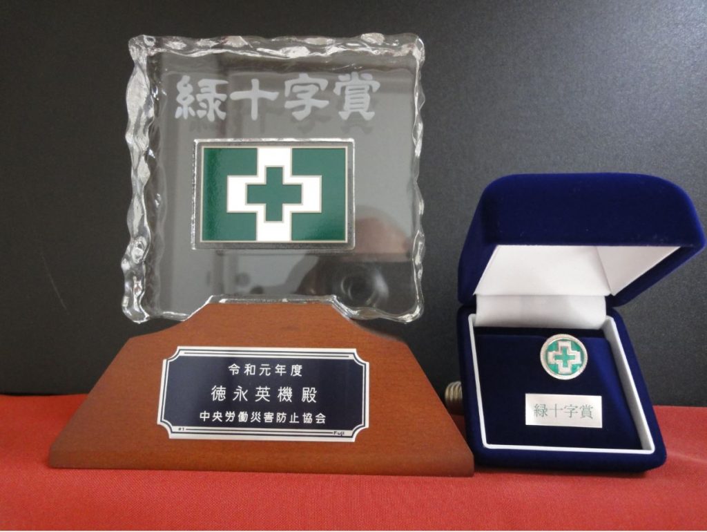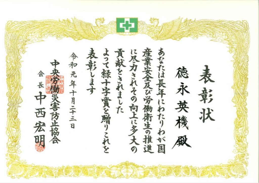 弊社 徳永英機氏が中央労働災害防止協会 様より、長年にわたる安全又は 労働衛生の推進向上に尽くし、顕著な功績が認められ、2019年度 緑十字賞を頂きました。